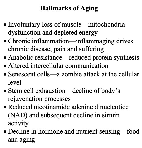Involuntary, age-related decline depicted in the above hallmarks of aging shows some of the various processes and systems that decline (involuntarily) with age. Researcher have identified up to twenty. But you can push back on all of them.